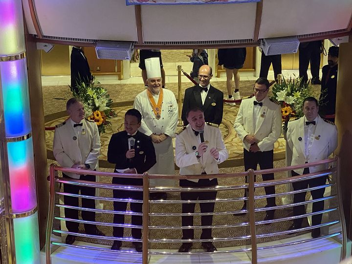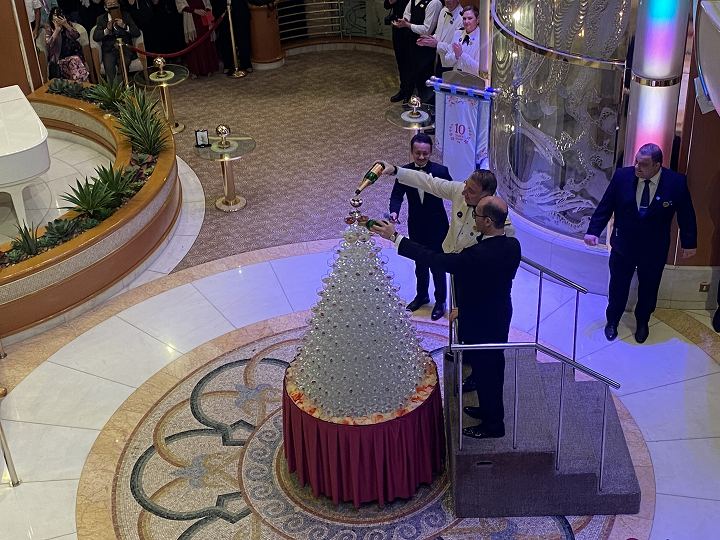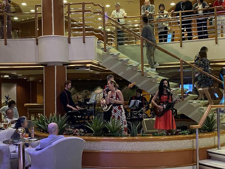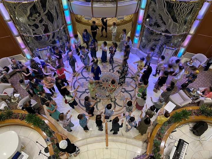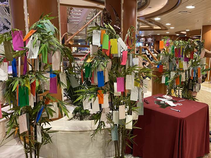 (フォーマルナイト) ![]() ______(ドレスコードで参加) ![]() __________(船長やクルーの挨拶) ![]() ______(ウェルカムグラスタワーパーティー) ![]() __________(バンドの生演奏) ![]() ________(クルーによるダンスショー) ![]() _________(7月7日の七夕飾り) ![]() ________(最終日に行われた盆踊り)