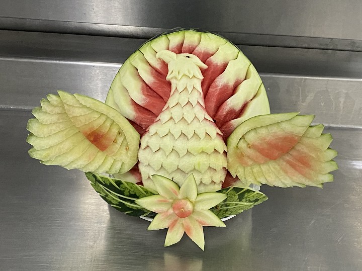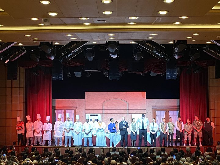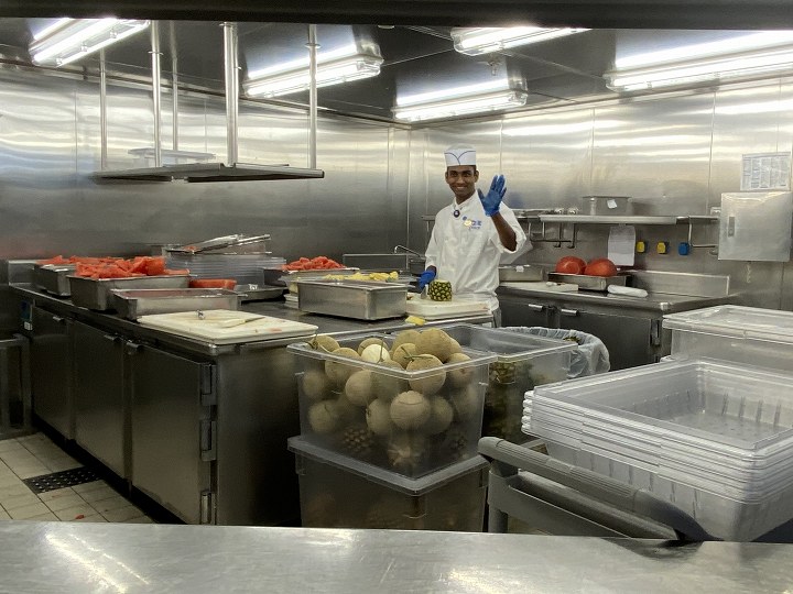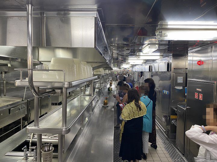 ![]() _______(調理の実演と厨房見学ツアー) ![]() ___________(料理長とクルー) この後 船内にあるキッチンを案内してくれました。 ![]() __________ _(清潔な厨房) ![]() _____________(ハーイ) ![]() ________(厨房にあったフルーツアート) |