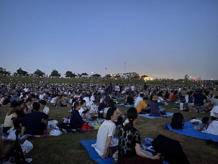 (河川敷にシートを広げて花火を待つ人)