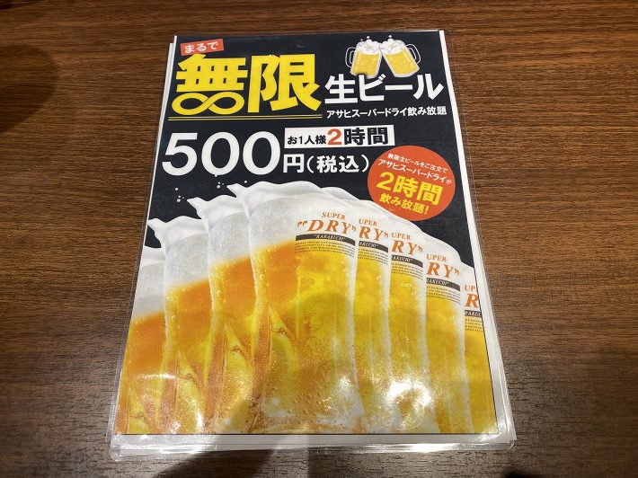 喜んだのは500円でビールが2時間飲み放題だったことです。