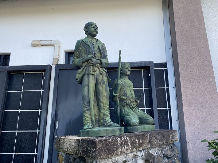 (自刃の地、左の隊士像が見ているのが鶴ヶ城)