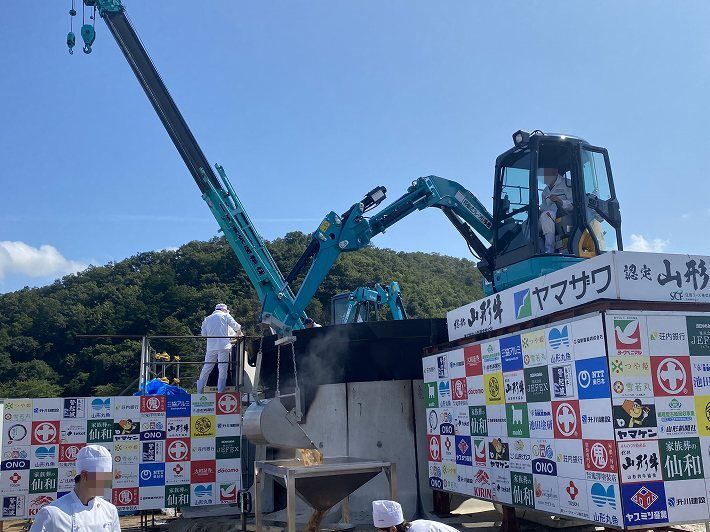(大鍋からバックホウで小分けします)