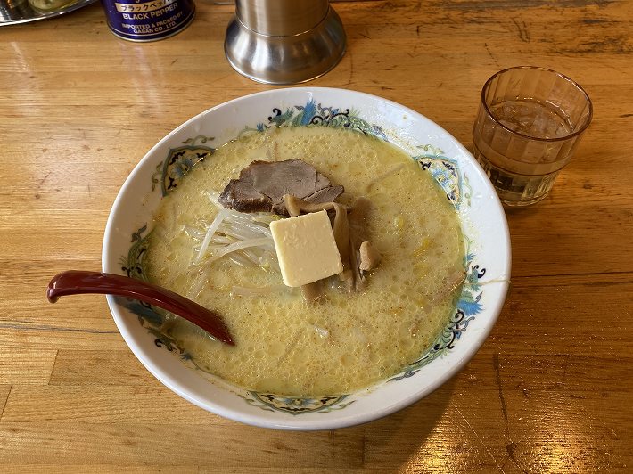 スープに チャーシュー、もやし、メンマ、バターがのってます。