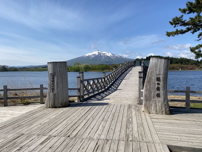 日本一長い木造の三連太鼓橋で、岩木山の雄大な山影を湖面に