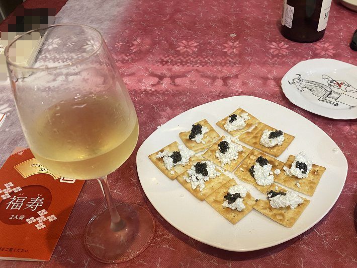 (ワインのつまみはクラッカーにクリームチーズとキャビアを乗せて)