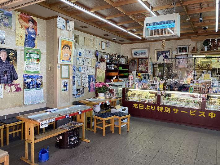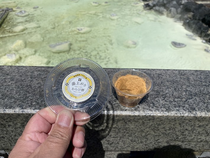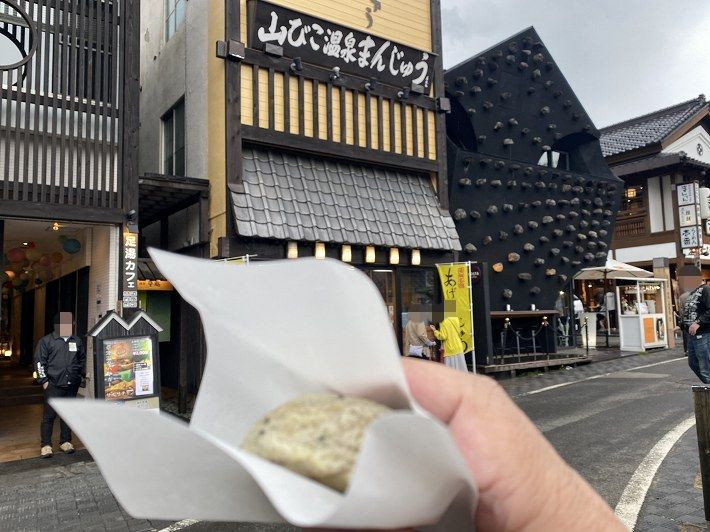 (温泉まんじゅうの試食を勧める長寿店の人)