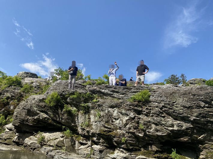 ________(岩の上で手を振る観光客)