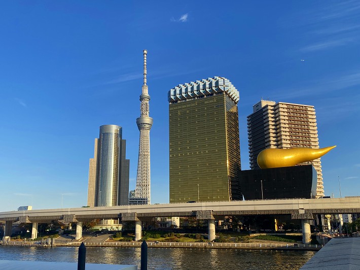 (吾妻橋から見た墨田区役所・スカイツリー・アサヒビール本社)