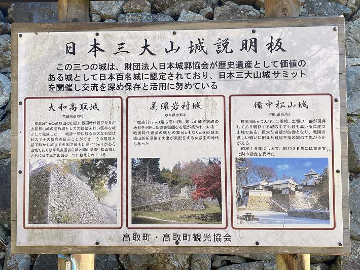![]() ![]() ___________(高取城跡入口) ![]() _______(このような道を10分強歩きます) ![]() __________(途中にある階段) ![]() ___________(壺坂口中門跡) ![]() _____(入口から10分歩いた三ノ丸にある案内板) ![]() ____________(大手門跡) ![]() ____________(二ノ丸) 高取城は岡山の備中松山城と岐阜の美濃岩村城に並ぶ日本三大 山城の一つです。 ![]() ______(二ノ丸にある日本三大山城説明板) ![]() _________(二ノ丸広場にある東屋) ![]() ___________(十五間多門跡) ![]() ____________(太鼓櫓跡) ![]() ___________(本丸の案内) ![]() _____________(本丸) ![]() ___________(本丸の説明板) |