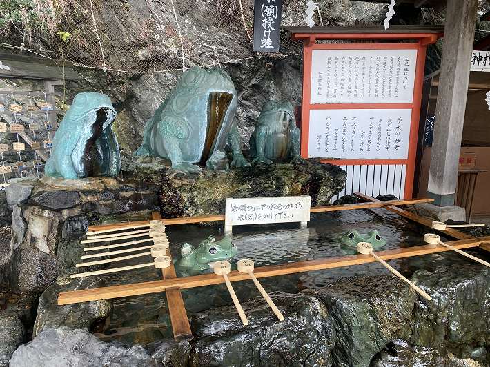 _(手水舎では水の中にある満願蛙に水をかけて願掛けします)