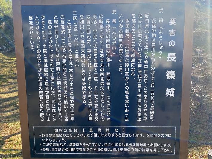 ![]() ________(長篠城址・歴史保存館) ![]() ___________(長篠城の説明) ![]() ____________(帯郭址) ![]() _________(周囲に掘られた空堀) ![]() ____________(本丸広場) ![]() _________(長篠城本丸跡の標柱) ![]() ____(本丸の奥にある 烈氏・鳥居強右衛門の磔場所) ![]() ____(烈氏・鳥居強右衛門の説明) ![]() ________(駐車場にある さかさ桑) ![]() ___________(さかさ桑の説明)