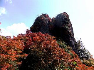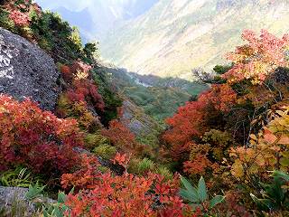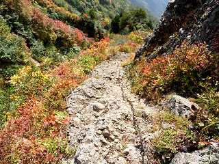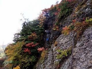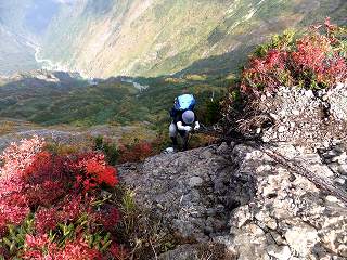 (最近 滑落したような痕跡があったクサリ場)__(クサリ場の疲れを癒してくれた紅葉)