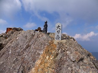 大日岳の山頂には 倒れかけの鐘とバラバラになった石の祠の奥に八海山大神のブロンズ