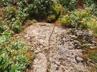山腹をトラバースする迂回路は幅の狭い道で、南西側が深く切れ落ちた崖になってます。