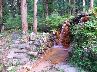本殿の左に 鉄分を含んだ温泉のような赤い滝が流れていて、その横にイザナギ(男神)と