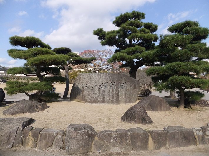 大手門の前に世界文化遺産・国宝 姫路城のプレートと石碑があります。