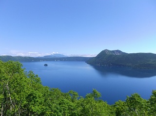 (摩周湖展望台から見た硫黄山と屈斜路湖)