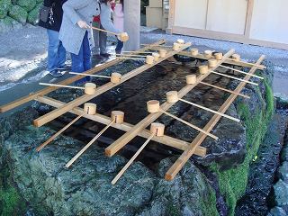 お清めは、柄杓に汲んだ1杯の水で 1-左手を清める、2-右手を清める、3-左手に溜めた