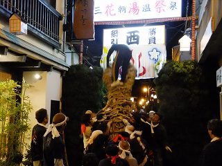 この日は三朝温泉の祭りがあって、軽トラの後から 藤カズラを束ねたものを引きずる集団が