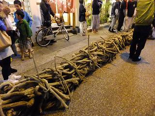 束ねた藤カズラの最後尾が輪っかになっていて、温泉街の入り口にある看板の下で 若い