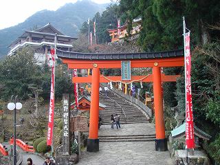 一の鳥居から長い石段を登った上にある二の鳥居の右に那智大社の本殿があります。
