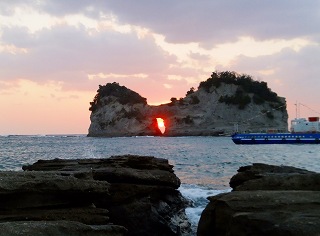 夕陽が海蝕洞に収まった写真は 南紀白浜を紹介したパンフレットで何度も目にしました。