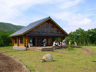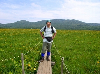 休憩舎の前にある 広い草原から ニッコウキスゲの黄色い絨毯に囲まれた雄国沼の奥に