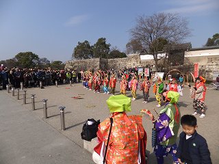 天守閣の見学を終えて外に出ると、派手な衣装をまとった中高年の方が「南京玉すだれ」の