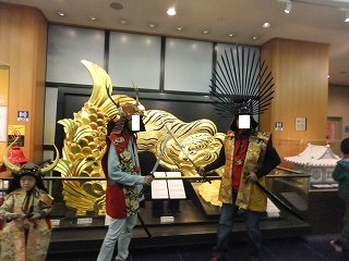 (鯱と伏虎のレプリカの前でポーズをとる人)