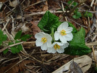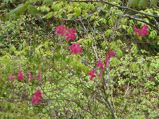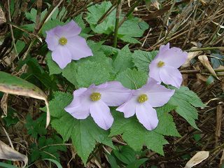 尾瀬戸倉から鳩待峠に向かうタクシーで、運転手さんが車を止めて 対岸に咲くシラネアオイ