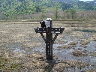 鳩待峠から50分歩いた所で川上川に架かる橋を渡った所に山の鼻の標識が立っています。