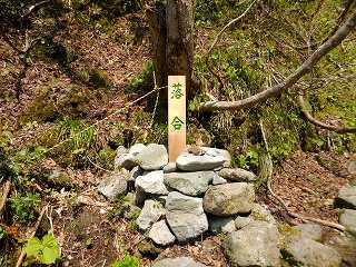 登山口から35分登った所で 水量の多い沢の対岸に落合の標識がありました。