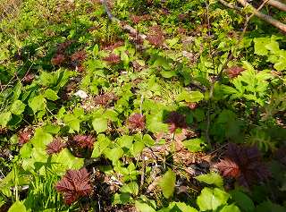 登山道の下に群生していたヤグルマソウは赤い葉を開いたばかりでした。