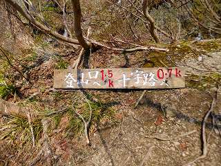 (登山口へ1.5k、十字路へ0.7kの案内)
