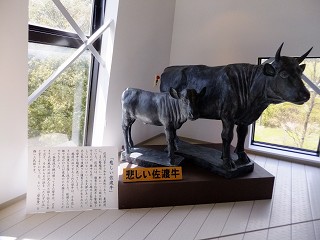 母牛は力尽きて大杉地区の浜で死んだという民話の「悲しい佐渡牛」のブロンズがあります。