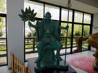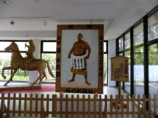 曙の優勝額の隣に、天狗塚の天狗のブロンズ像と 佐渡に攻め入った越後の上杉景勝と