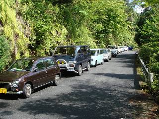 (誘導員の指示で路肩駐車をした車)_____(白谷雲水峡の入り口にある管理棟(右))