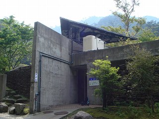 滝が見えて、その奥の駐車場に 白谷雲水峡のイメージにミスマッチなトイレがあります。