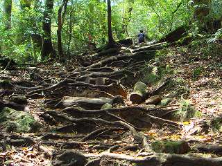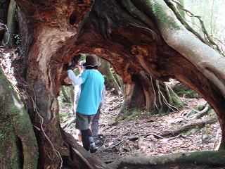 遊歩道には屋久杉の下をくぐる所が何ヶ所かあって、リョウブの根をくぐる所では人が立って