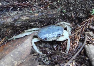 (木の根がむき出しになった原生林歩道)______(登山道にいた青いサワガニ)