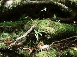 木漏れ日が当たる苔の所に 根付いた若木の頑張る姿がありました。