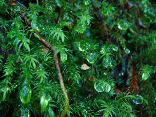 原生林の中にある巨木に生えた苔を良く見ると 宝石のような水滴が付いていました。