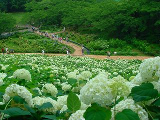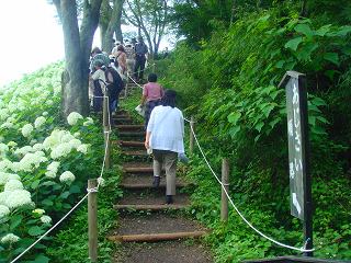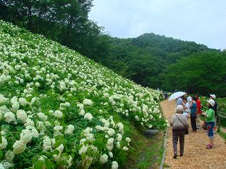 池の横を通ってアジサイが点在する傾斜の緩い坂を登って行くと 最初のアナベルの群生地が