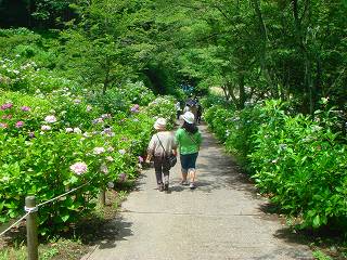 左斜面にあるチップ材が敷かれたジグザグの散策路を登って行くと、最上部に アジサイ園の