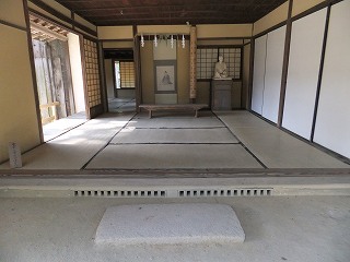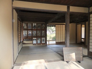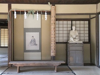 をしたと思われる机の後ろにある床の間に肖像画が書かれた掛け軸があって、その隣にある