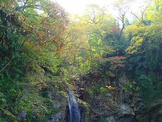 紅葉が色付き始めた滝の上を眺めていると 滝の上から人の声がして、姿が見えたと思ったら