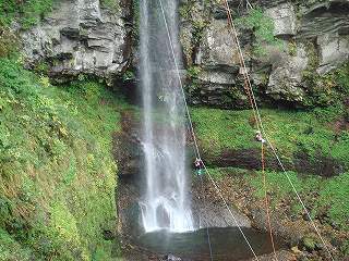 この人たちが里山アドベンチャーの競技者で、この滝が ロープアクティビティの場所でした。