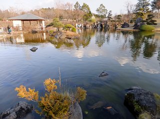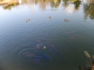 横超の橋の右に本願荘厳の庭があって、日本庭園の池に鯉とマガモが泳いでいました。