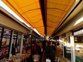 入り口の正面に正門があって、手前の右にある仲見世に土産物屋さんが並んでいます。