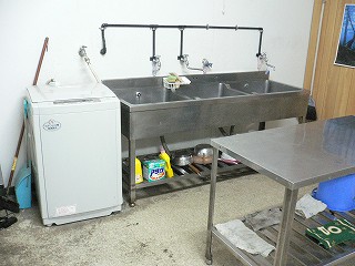 部屋の片隅に洗濯機と流し台があって 簡単な料理が作れるステンレス台もあります。